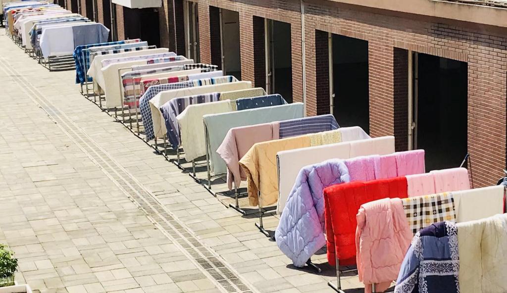 4月28日,艳阳高照,一大早,大家就来到学生宿舍,认真核对每位学生晒被宿舍楼号、寝室号、床位号,贴标签,搬被子,大家分工合作,齐心协力,在大好的阳光沐浴下,一条条五颜六色的被子挂满了整栋宿舍晾衣架,场面十分“热闹”。大家干得热火朝天,汗流浃背,待被子蓬松了再收回叠好,已经是下午五点多了。